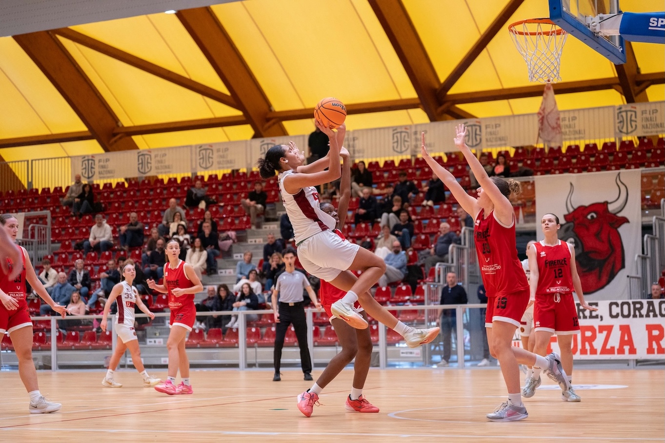 Bella, appassionante, infinita. Fra Firenze e Venezia è partita da incorniciare, per i parziali e controparziali che non chiudono mai il pronostico, e per un canestro, quello dall’arco di Eva Rossi, che sì, mette il punto esclamativo sul match. La tripla della n. 19 toscana vale l’ultimo sorpasso dell’incontro, e regala alla Firenze Basket Academy il primo sorriso dopo i due ko dei primi due giorni di Chiusi e Chianciano Terme. Prima del buzzer beater (50-49), la sfida aveva visto la squadra di coach Corsini prendere il largo nel terzo quarto, in cui si registrava il massimo vantaggio dell’Academy dalla palla a due (+13). Venezia, leader del Girone Rosso – ininfluente la sconfitta di oggi ai fini del primato nel raggruppamento – si era fatta sorprendere dalla veemenza delle avversarie, ma è stata brava a risalire con il break da 26-7 griffatto Isabel Hassan (doppia doppia da 26 punti e 11 rimbalzi) e Anna Sablich, autrice dei 5 punti consecutivi per il 46-43 Reyer a 4′ dalla fine. La voglia di Firenze è stata tutta nel non abbattersi nel momento più difficile, e all’ultimo secondo il tiro da 3 di Rossi ha risolto una splendida sfida.